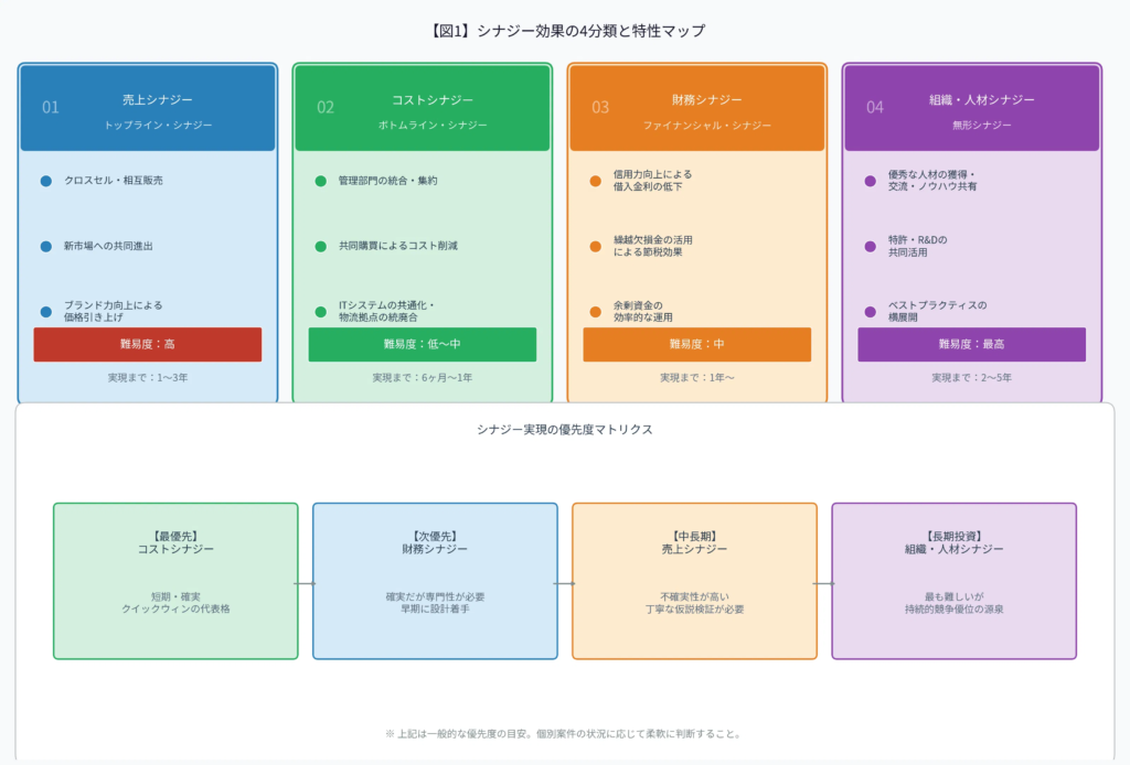 シナジー効果を定量化する前に、まずはシナジーの種類とその特性を正しく理解する必要があります。シナジーは大きく以下の4つに分類されます。
