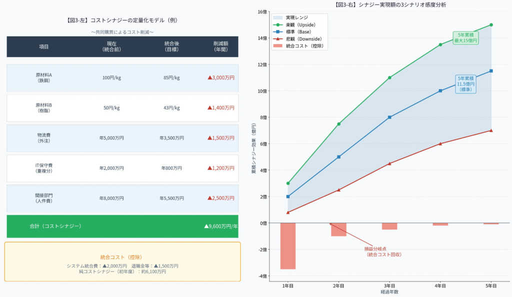例えば、「共同購買によるコスト削減」であれば、「対象となる調達品目」「現在の単価」「統合後の目標単価」「年間調達量」といった変数を特定します。