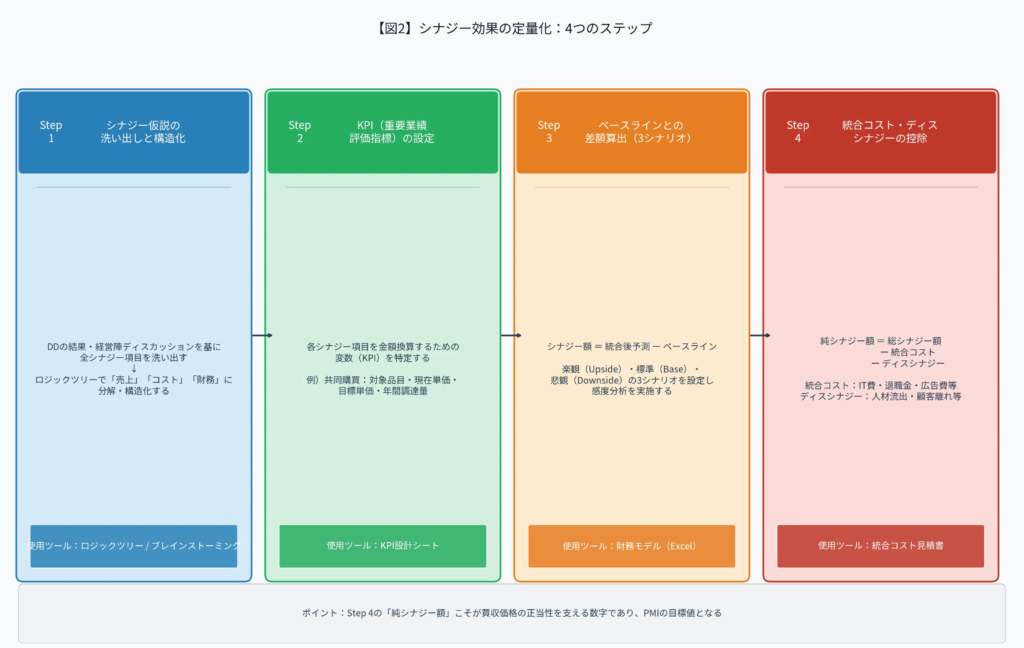 シナジーを「期待」から「目標」に変えるためには、厳密な定量化が不可欠です。定量化は以下のステップで進めます。